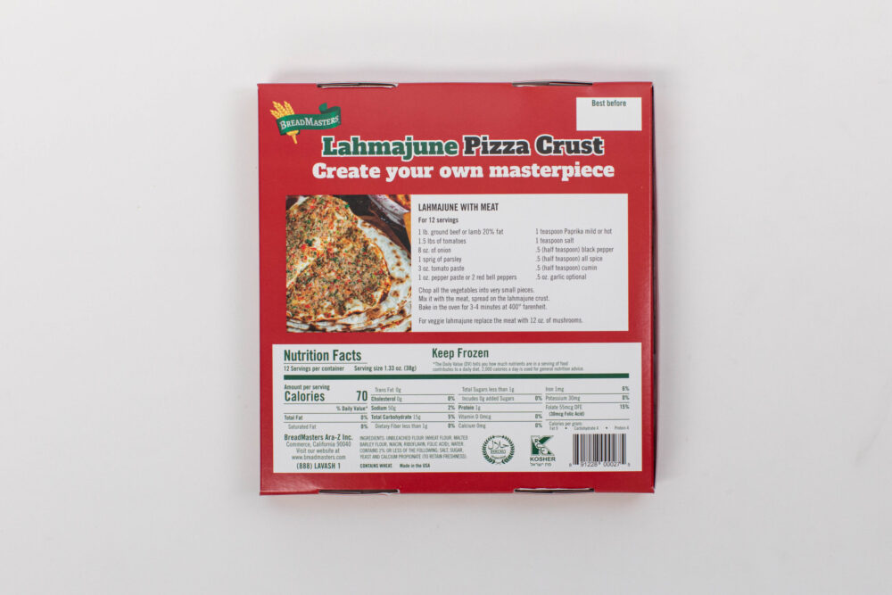 Experience the authentic taste of Armenian pizza at home with our convenient, pre-baked Lahmajune crust. Explore our full collection of Middle Eastern flatbreads for more traditional options.